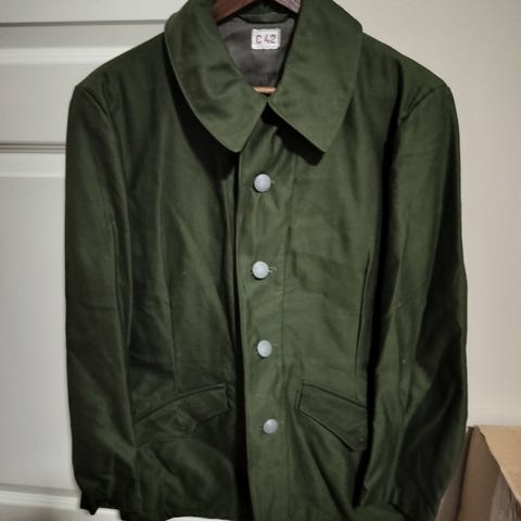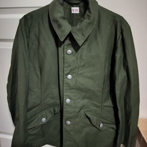 Hupullinen vihreä armeijatakki. Koko vastaisi ehkä iso S tai pieni M. Paksuhko tupla kangas, syys/kevät takki.