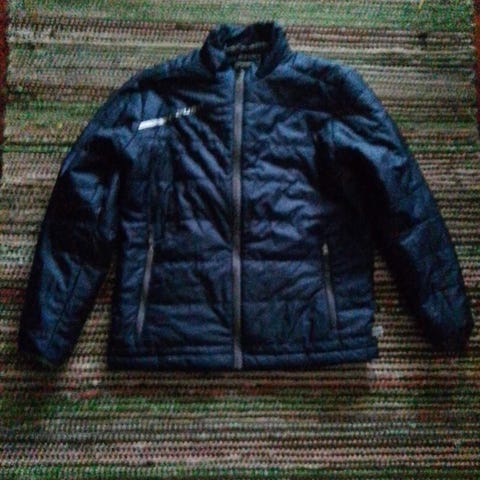 Käytössä ollut lasten kevyttoppatakki seuraavalle. Hihoissa tummemtumaa joka ei ole pesussa lähtenyt.