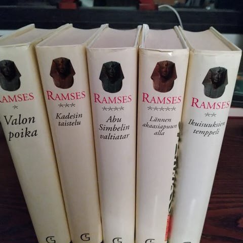 Christian Jacq Ramses-kirjasarja suomenkielisenä, sisältää useita osia eri aiheista. Kirjat ovat pehmytkantiset sidonnassa, valkoisilla kansilla ja selkeillä kansiteksteillä. Sarja sopii lukemiseen ja tiedonhankintaan suomenkielisille lukijoille. Luettu kerran mutta taite jäkiä.