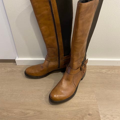 Tamaris saappaat, polveen asti 4cm kantakorolla. Nahkaa edestä ja varren takaa tekstiiliä, mikä joustaa erinomaisesti tehden kengästä miellyttävän käyttää ja sopivan monenkokoiselle pohkeelle.
