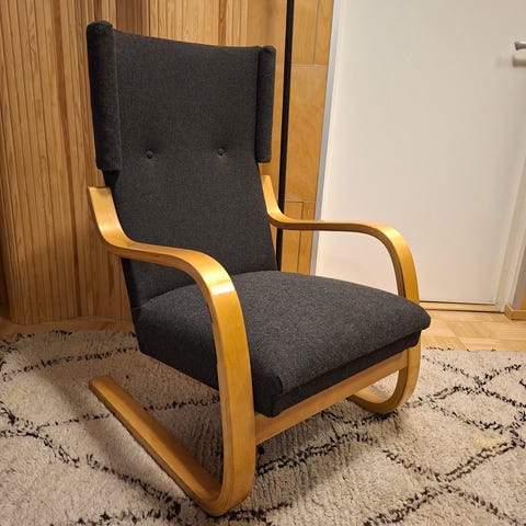 Artek – Aalto – Alvar Aalto – nojatuoli – 402 – lounge chair – design – suomalainen design – vintage – koivuvaneri – musta nahka – aito nahka – klassikko – keräily