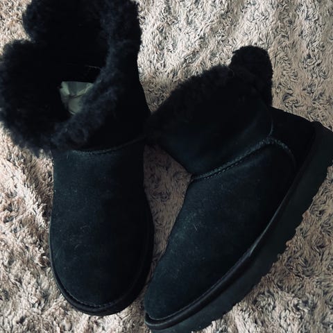 Siistit UGG pitkävartiset saapikkaat. Tosi lämpöiset. Hiukan kulumaa mokkanahan pinnassa. Alkuperäisen kenkälaatikon saa mukaan.