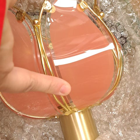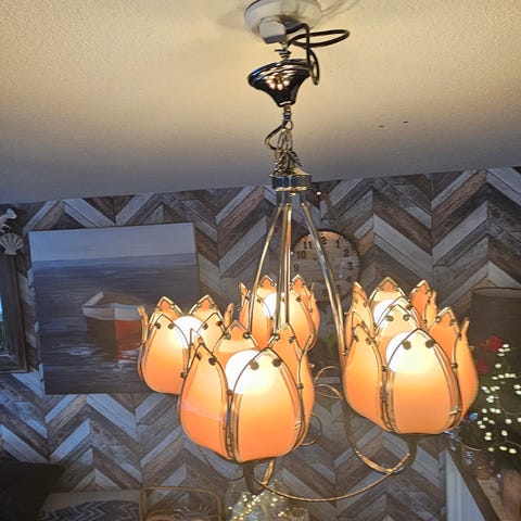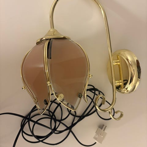Pienen kukanmallisen kullanvärisen metalli&lasikuvun ja uusien sähköosien muotoilema kaunotar. Uusi ja uniikki, toista ei ole eikä tule. Sähkömies tehnyt.