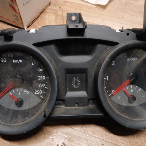 Renault Megane 1.6 vuoden 2005 auton mittaristo. Sopii Renault Megane -malliin ja sisältää nopeusmittarin, kierroslukumittarin ja polttoainemittarin. Musta väri ja alkuperäinen varaosa.