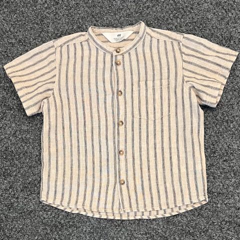 Myydään Lindexin sinivalkoraidallinen lasten paita. Koko 98 cm. Materiaalina 76 % puuvilla ja 24 % pellava. Paita on pitkähihaista mallia, jossa on nappikiinnitys edessä ja pieni rintatasku. Myös hihansuissa ja hihatampeissa ruskeita nappeja. Selässä laskos. Kaareva helma.