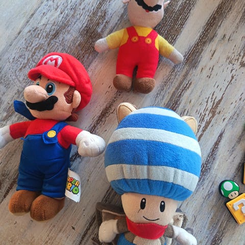 Reppu ja Luigi pehmolelu. Nämä kaipaa pesua.