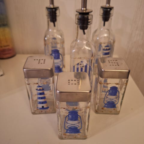 Säröt kahdessa jauhokipossa ja kolmessa maustekupossa. Noita lasisia mauste-ja jauhokippoja löytyy joskus kirppateilta tai rompetoreilta. Itse käyttäisin noin, mutta tuunaamallahan tästä saisi mieleisensä.