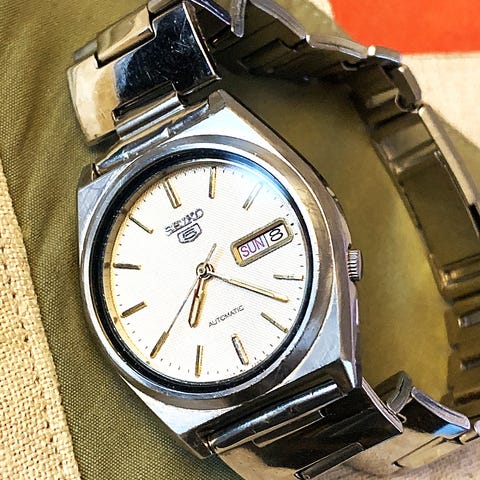 Tästä harvinaiseksi käyvä komea SQ-malliston Seiko, vieläpä valkoisella taululla ja day-datena! Serialin mukaan helmikuulta 1990. Keväällä laitettu uusi paristo. Kauppaan kuuluu kuvien Seiko-boxi.