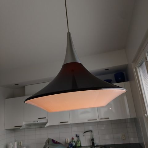 Todella upea Yki Nummen suunnittelema Apollo kattovalaisin. Valaisin on tehty kauniisti valoa taittavasta valkoisesta ja ruskesta/harmasta akryylista. Varjostimen korkeus noin 45 cm ja halkaisija 55 cm.
