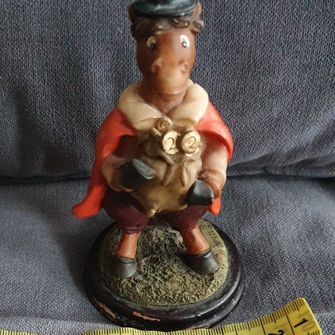 Keramiikkainen hevosenfiguuri, jossa on harmaa ja musta väri. Hevosen korkeus on noin 15 cm ja pituus noin 18 cm. Figuri on valmistettu kiiltäväpintaisesta keramiikasta ja esittää laukkaa hevosta. Sopii koriste-esineeksi tai keräilykohteeksi.
