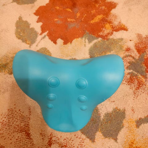 Niskatuki, joka on ergonomisesti muotoiltu niskan ja hartioiden tueksi. Väri sininen. Valmistettu pehmeästä ja joustavasta materiaalista, joka mukautuu käyttäjän kaulan muotoon. Mitat noin 21,5 cm leveä, 16 cm syvä ja 11 cm korkea. Sopii käytettäväksi rentoutumiseen, niskan lihasten venyttelyyn ja asennon tukemiseen.