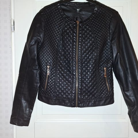 Pehmeä keinonahkainen musta lyhyt takki irroitettavalla keinoturkiskauluksella. Täysin ehjä ja virheetön. Koko käy M/L kokoisille. Tarkemmat mitat saa pyydettäessä.