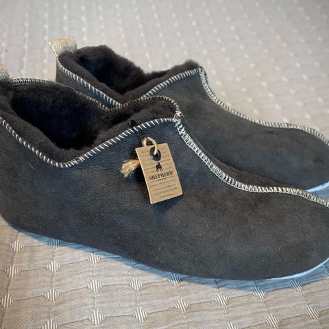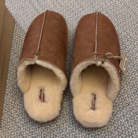Shepherd -merkkiset Henrik lampaannahka ja villa tohvelit. Todella lämpimät ja pehmeät. Väri antique/cognac eli konjakinruskea. Koko 42, vastaa mielestäni kokoaan, tai ei ole ainakaan erityisen pientä kokoa.