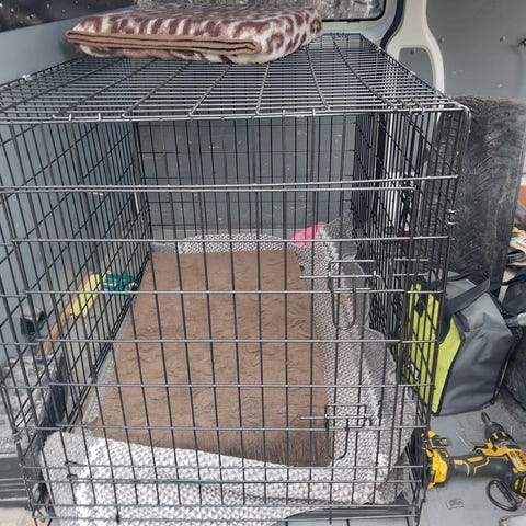 Kokoontaitettava metallihäkki koiralle. Pohja 70 x 100 cm, korkeus 75 cm. Kaupanpäälle suoja häkin päälle.