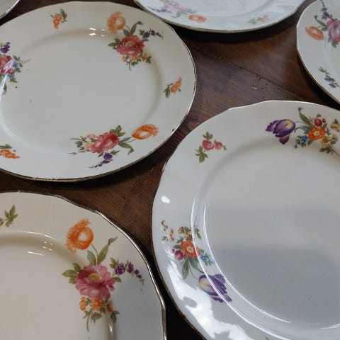 Arabian valmistamat värikkäin kukkasiirtokuvin koristetut AS-mallin eri kokoiset lautaset.