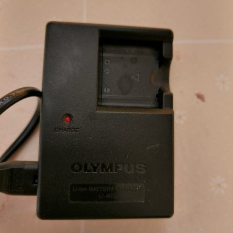 Olympus kameran ylimääräiseksi jäänyt toimiva laturi. (Kameran malli: SP-720UZ). Kamera ja akku voidaan tämän avulla kytkeä lataukseen seinän pistorasiaan tai Usb-liitäntään, Usb-kaapelin avulla. (Nouto tai postituskulut lisätään hintaan).