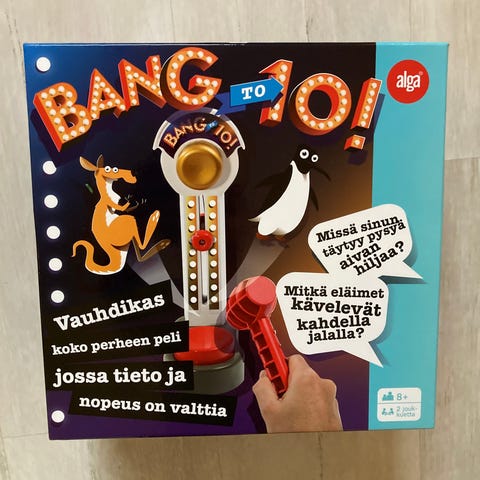 Bang to 10!lautapeli. Pelin tarkoituksena on yhdistää tietoa ja nopeutta hauskassa kilpailussa. Lyö vasaralla kun tiedät vastauksen.