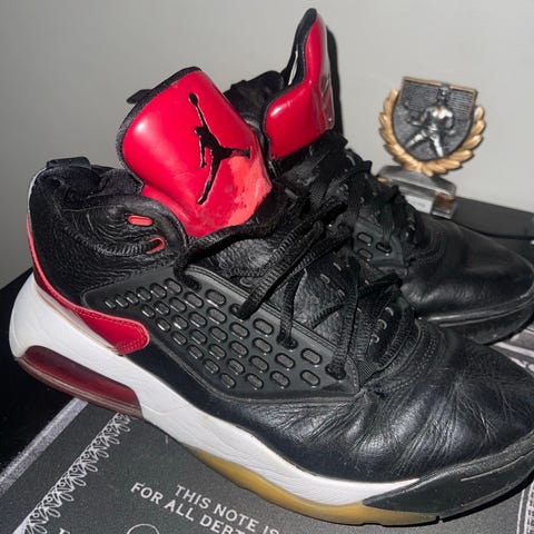 Air Jordan Tennarit koko 43. Kengät ovat mustan ja punaisen väriset. Materiaalina on käytetty nahkaa ja synteettisiä materiaaleja. Soveltuvat vapaa-ajan käyttöön.