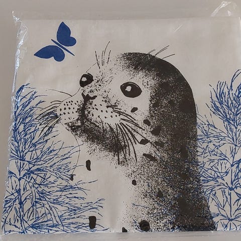 Tyynyliina avaamattomana paketissa. Oikeassa muovin ylänurkassa pieni hintalapun jättämä liimajälki.