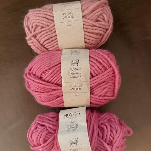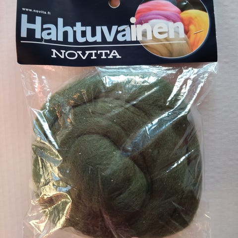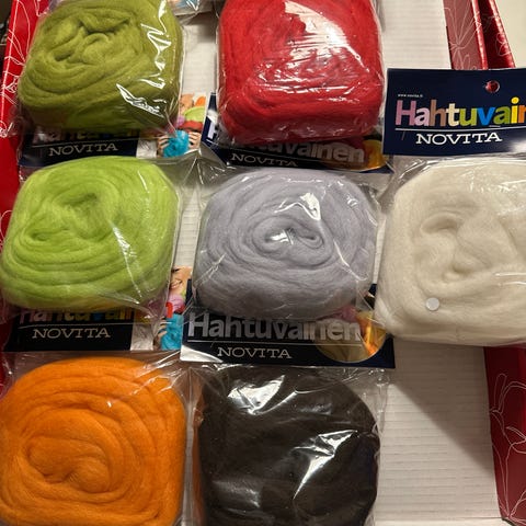 Novitan lankoja. 2 kpl 50g ja 2 kpl 30g punaisia keriä. 2 kpl 50g (erisävyistä )vihreää kerää, 1kpl 50g ruskea kerä.