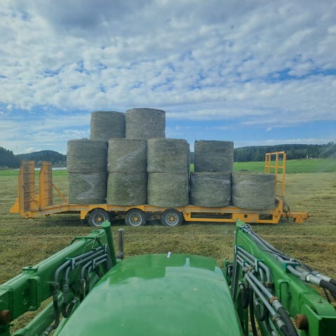 Traktori käyttöinen viljanmurskain. Toimiva ja pitkällä kuljettimella.