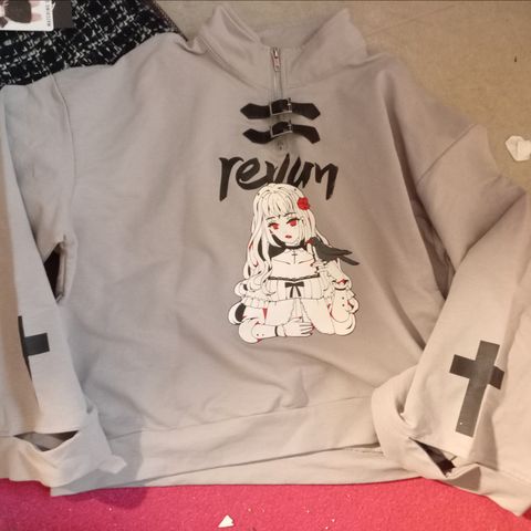 Anime nuorten huppari, koko XL, valkoinen väri. Hupparissa on vetoketju edessä ja siinä on värikäs anime-tyylinen printti, jossa on sinihiuksinen hahmo ja japaninkielisiä tekstejä. Materiaali ei ole erikseen mainittu. Vaatteen malli on rento ja sopii arkipukeutumiseen.käyttämätön
