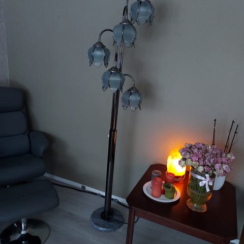 Upea ja näyttävä vintage-jalkalamppu, ns. “kissankello”-mallia. Useita kukkamuotoisia valaisinkupuja ja messinkinen runko marmorijalalla. Erittäin näyttävä sisustuselementti, joka toimii myös tunnelmavalona olohuoneessa tai makuuhuoneessa.