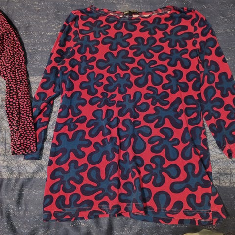 Marimekko Longi tasaraita trikoopaidat, koko L. Toisella olkapäällä metallivetoketju. Kunto hyvä. Oranssissa pieni jälki( näkyy kuvassa) ja tämä huomioitu hinnassa. Musta moitteeton kunto. Värit muuten kirkkaat molemmissa. Mitat: kai-kai 52cm, helma 52cm ja takapituus 65cm. Myydää settinä, eli hinta kahdelle paidalle. En käytä toridiiliä, mutta postitus onnistuu.