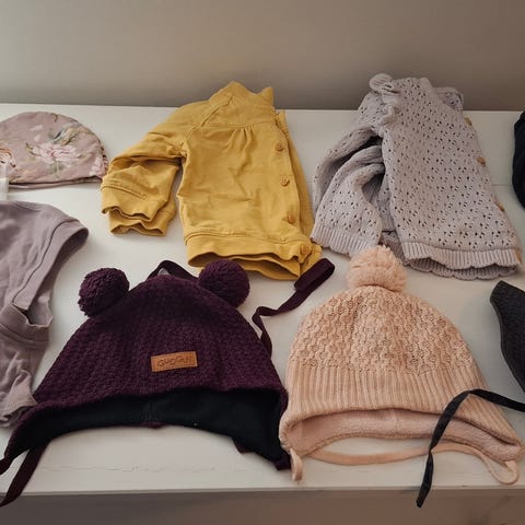 Merkkeinä lupilu, lindex, name it, h&m, ciraf, mywear, zy baby, cubus. Osa äitiyspakkauksen tuotteita ja osa itse tehtyjä (pannat).