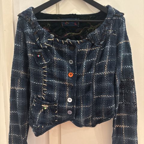 Kiva juhlava musta jakku Nu Denmarkilta. Jakussa yhdistetty eri materiaaleja, kuten tekoturkista, nahkamaista kangasta, neulosta ja sifonkia. Hihoissa rengasniittinauhat. Käytetty vain muutaman kerran. Hyvässä kunnossa, ei nyppyjä tms.