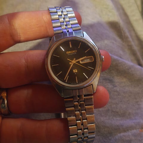 Omasta mielestäni näissä on enemmän fiilistä kuin uusissa Seikoissa, ja nämä kuitenkin luotettavalla japanilaisella kvartsikoneistolla. Tämä yksilö vieläpä Seikon omalla SQ-metallirannekkeella ja komealla Seiko-laatikolla. Tarjoa jos siltä tuntuu!
