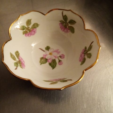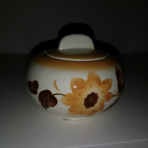 Isompi koristeellinen posliiniastia, jossa on kansi. Astian halkaisija on noin 20 cm. Astian pinnassa on kukka- ja lehtikuvioita sinisellä ja vaaleilla sävyillä. Käytetty materiaali on posliini. Sopii koriste-esineeksi tai säilytykseen.