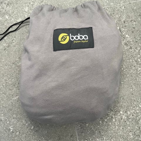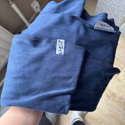 Trikookantoliina Me&Mama, jossa on erillinen säilytyspussi. Kantoliinan pituus on n. 5,3 metriä. Leveimmältä kohdaltaan kantoliina on n. 60 cm ja päistä n. 22 cm leveä. Liinassa voi olla jokunen melko huomaamaton pieni tahra. Säilytyspussissa on isompi kuvanmukainen himmeä tahra.