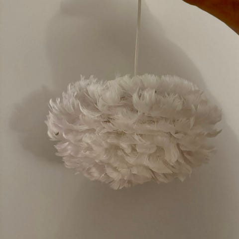Roikkuva valkoinen höyhenvalaisin, halkaisija n. 40cm. Kotimainen. Mukaan kaikki tarvittava, lamppu ja johdot yms että saa heti käyttöön :)