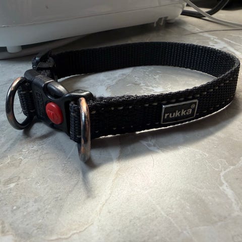 Rukka koiran kaulapanta, jossa on musta pohja ja kukkakuosi punaisilla ja vaaleanpunaisilla kukilla. Pannassa on muovinen lukko ja metallinen lenkki talutushihnaa vartenåå. Isolle koiralle.