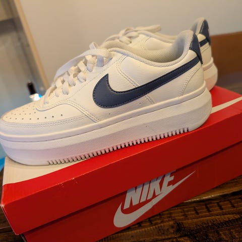 Nike Tennarit Court Vision Low, koko 40,5 /UK 6,5. Tytär osti omin päin kengät ja pieleen meni kokovalinta. Liian isot hänelle mutta ehti pitää pari päivää kun hoksasi virheensä.