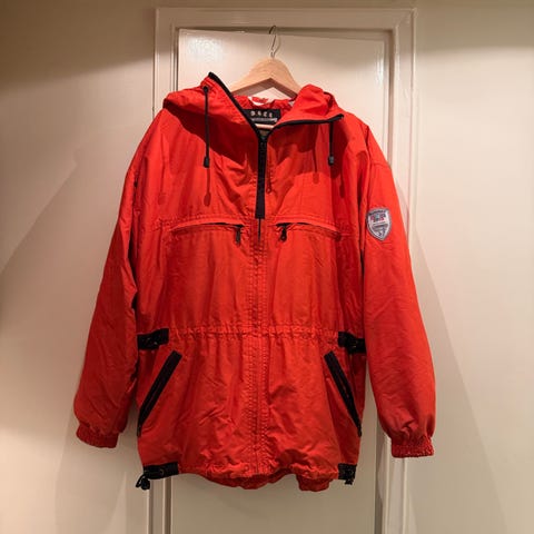 Vuoriton parka-takki. Mitat: kainalosta kainaloon sekä helman leveys n. 50 cm, olkapäästä helmaan n. 75 cm, olkapäästä hihansuuhun n. 64 cm, hihan leveys kainalon kohdalta n. 20 cm, hihansuuhun leveys n. 12,5 cm. Takissa neljä tilava taskua, syvä huppu ja korkea kaulus. Täydellinen siis tuulisiin syyspäiviin!