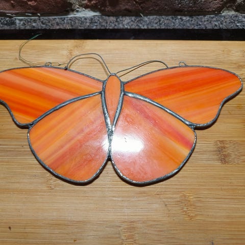 Lummetta esittävä Tiffany-tekniikalla toteutettu lasinen ikkunariipus. Auringonvalossa lasitöiden värit pääsevät parhaiten esille. Työn koko; leveys n. 36 cm, korkeus n. 27 cm. Nouto Lauttasaaresta.