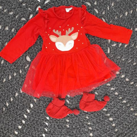 Tosi hyväkuntoinen setti jouluun. Mekossa on söpö poro-kuvio ja tylli alaosa. Housuissa väri ei enää niin kirkas kuin uutena. Ehjät ja tahrattomat.