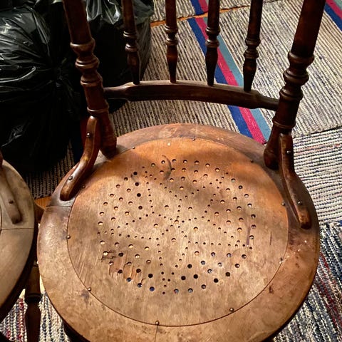 Myynnissä erittäin vanha puutuoli, jossa upea selkänojan leikkauskoristelu: neljä nelilehtistä kuviota ja soikea keskikuvio. Runko on tukeva ja puuosat hyvässä kunnossa. Istuimessa alkuperäinen kukkakuvioinen verhoilu, joka on kulunut ja kaipaa uusimista – täydellinen kunnostusprojekti tai sisustuselementti sellaisenaan