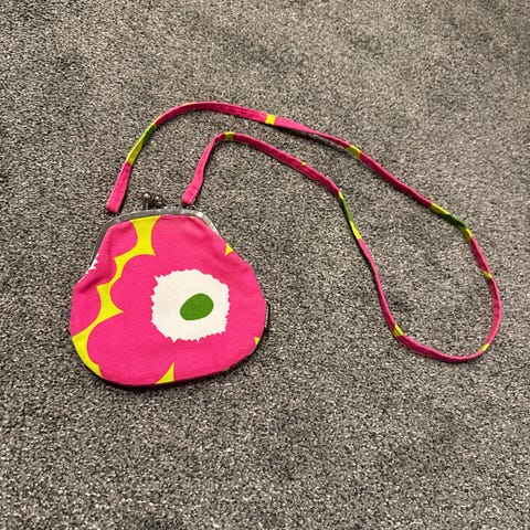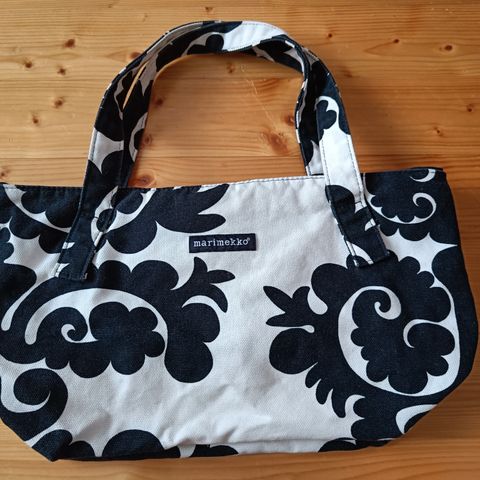 Ompelijalla joka on tehnyt Marimekon paksusta kankaista erilaisia laukkuja.Useita taskuja sisällä.Voin lähettää ärräpakettina