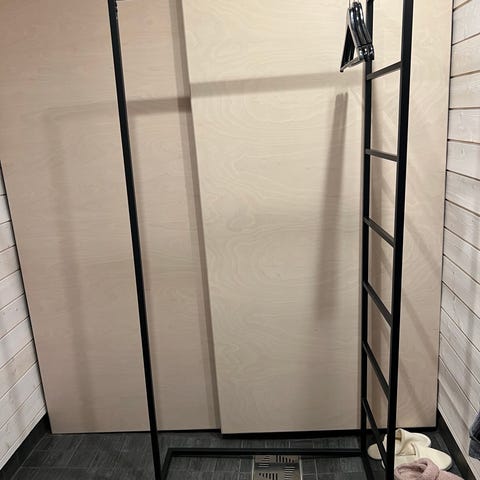 Vaateteline Gudme tupla musta/kromi. (JYSK) Säädettävät korkeudet. Kulkeutuu Jyväskylän ja Tampereen suuntaan omien menojen mukaan.