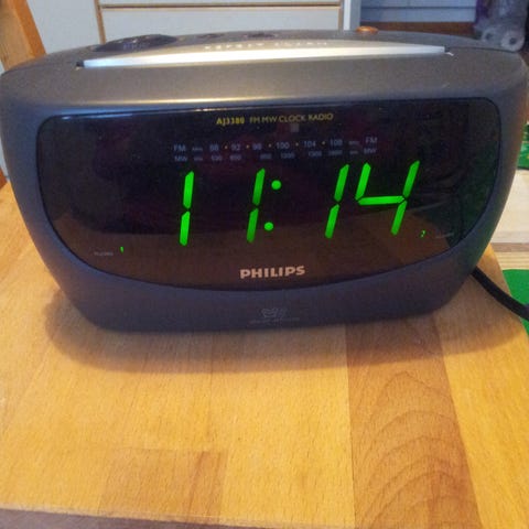 Philips digitaalinen herätyskello, musta väri, sisältää toistuvan herätysominaisuuden. Näyttää ajan digitaalisesti, sopii makuuhuonekäyttöön.