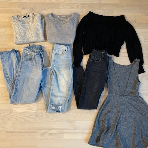 Eri pituisia mekkoja, yksi pitkähihainen, farkut, pari juhlahaalaria, farkkupaita, toppi, paitoja, neule eri merkkisiä