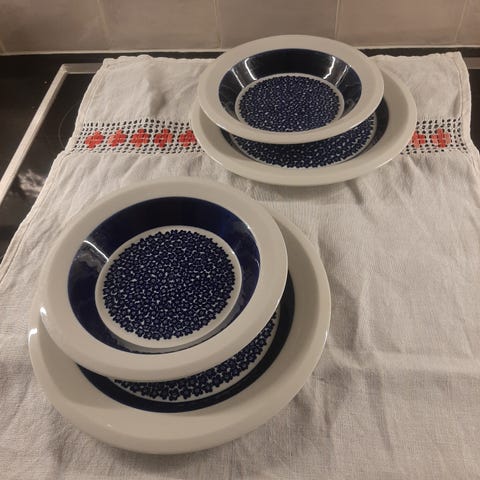 Arabia Faenza sinikukka kahvikuppi ja lautaset