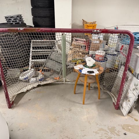 Jääkiekkomaali, jossa on punainen teräsrunko.