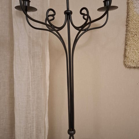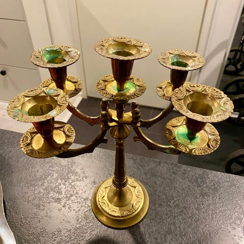 Vanha kynttilänjalka metallia ja sinistä lasia.