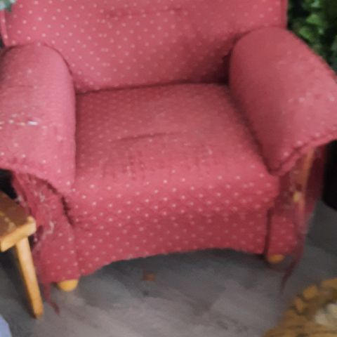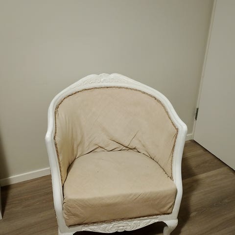 Jäykistys istuin tyynyn alla rikki. Irti toisesta reunasta. Verhoilu melko hyvässä kunnossa, mutta istuintyynyn alla etureunassa kulumaa. Ostettu Askosta 1980- luvun alussa.