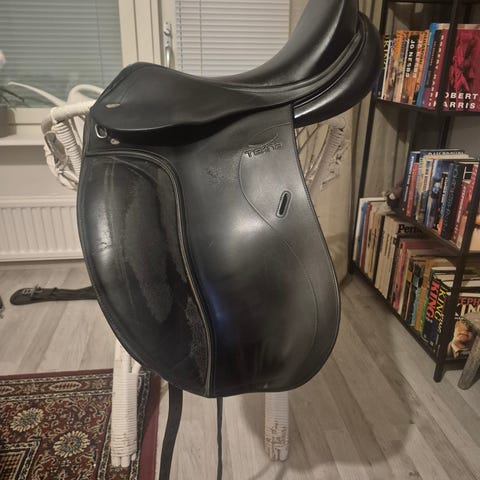 17 tuumaa(43 cm),mustalla kaarella.Mukaan satulasuoja ja vyö(kulunut).Käytön jälkiä toki näkyy.