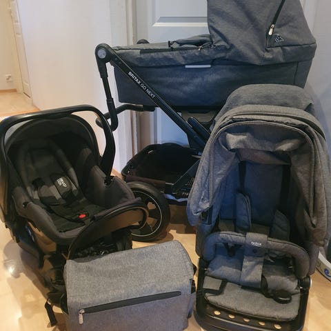 Britax Go Next stroller. Very practical and durable, easy to assemble. Comes with frame, stroller, carrycot, mosquito net and rain cover.